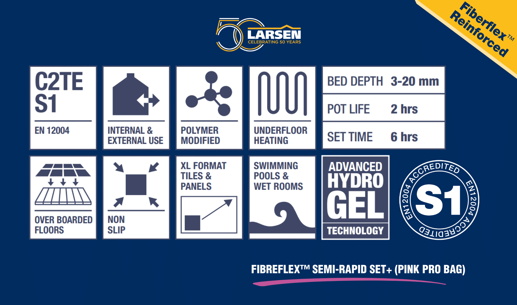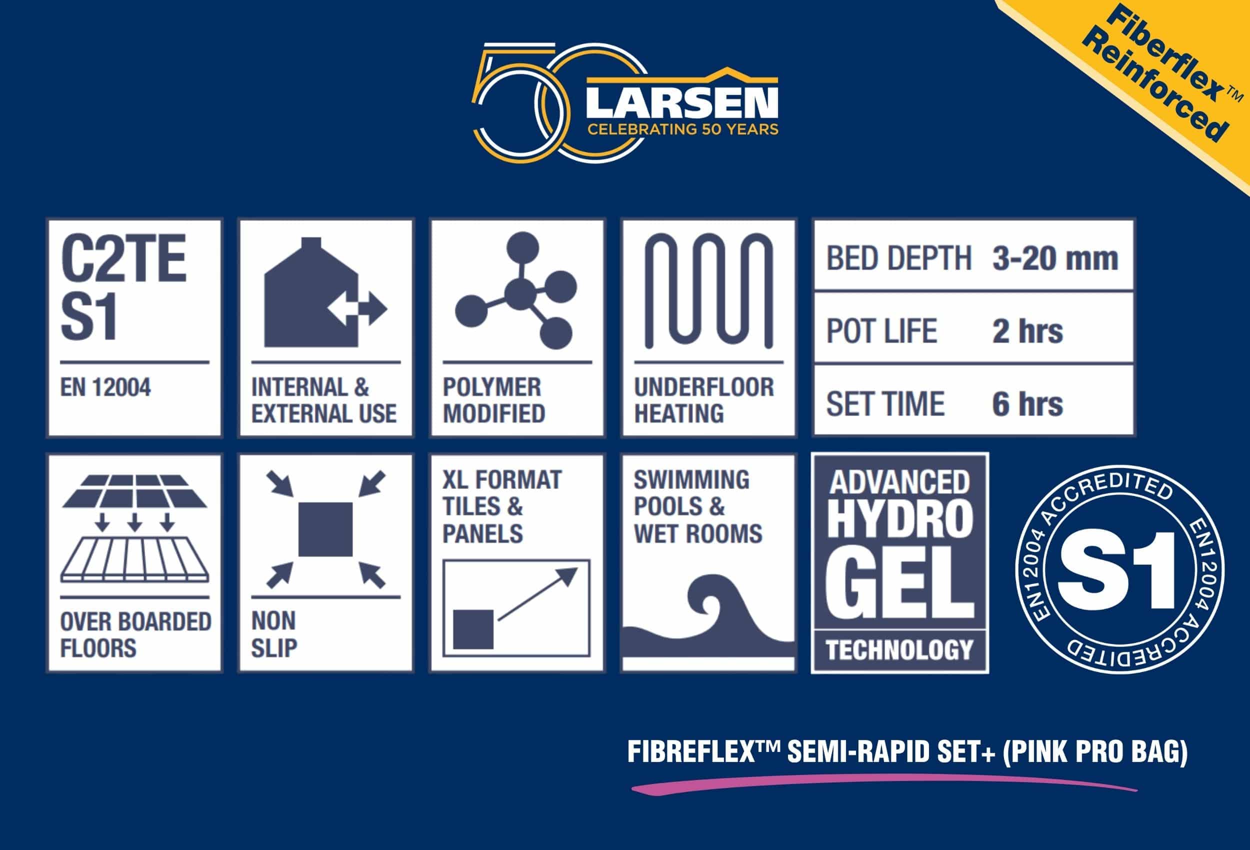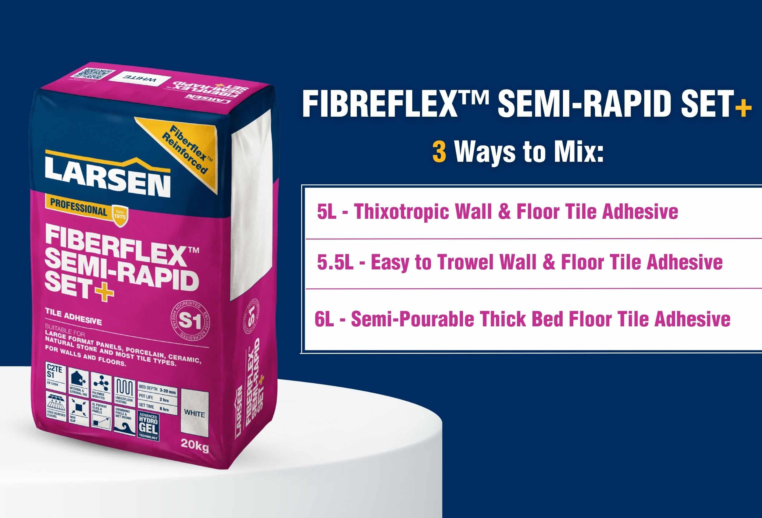 Developed from the Larsen lab, tile adhesives such as Semi-Rapid Set+ (Pink Pro Bag), contain Larsen Fibreflex™ ingredients. These ingredients include specially selected microfibre particles for extreme, flexible adhesion. Providing the solution to crack resistance, thermal expansion, vibration tolerance and even water resistance.