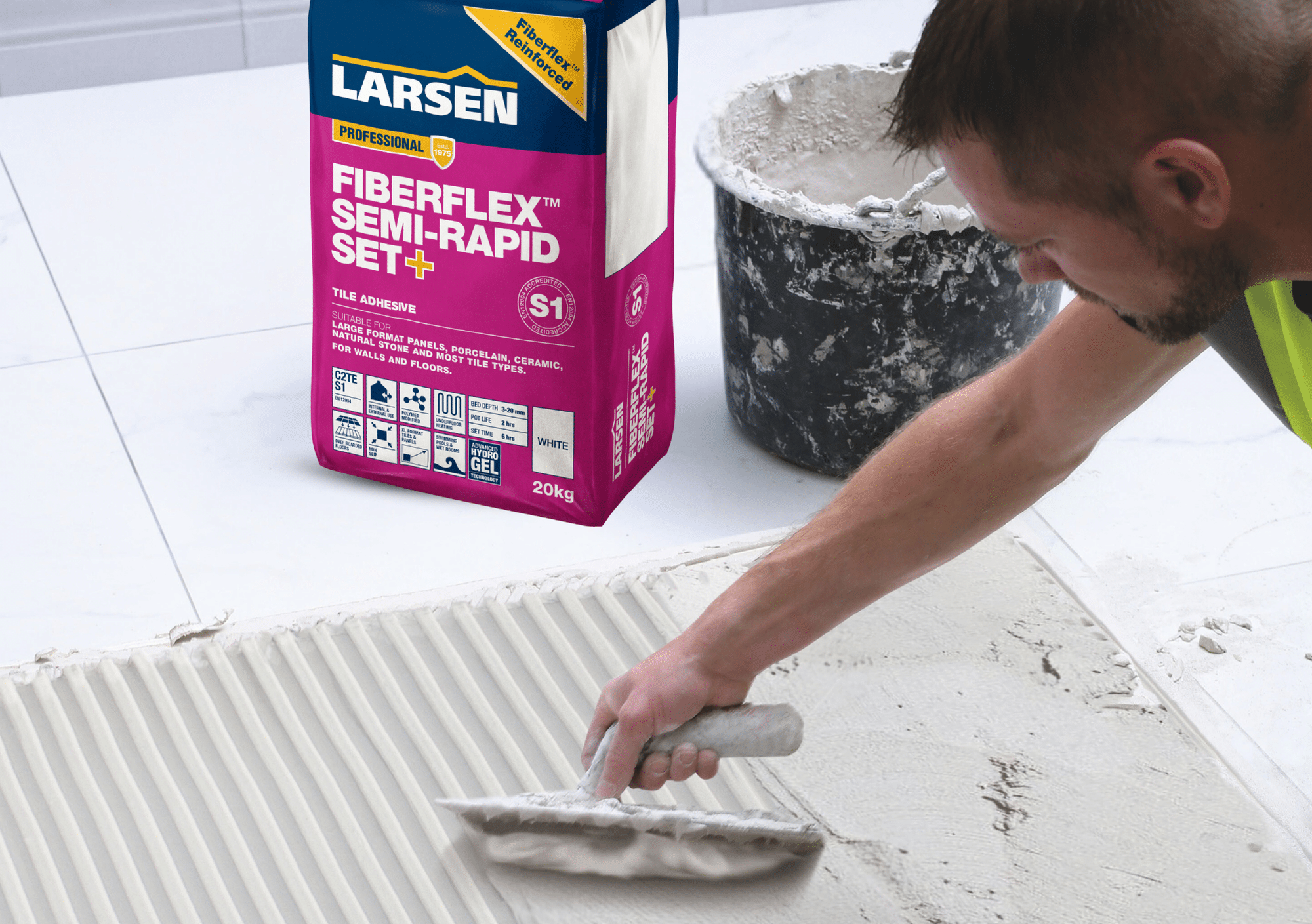 Larsen Fibreflex™ Semi-Rapid Set+ is a fully flexible, CT 2E S1 rated, microfibre reinforced, non-slip, cement-based adhesive. The specially formulated semi-rapid setting binder has been developed to provide a long pot life and open time, with subsequent rapid strength development. Containing Fibreflex™ particles and Advanced HydroGel Technology, there’s no wonder why this is tile adhesive is the go-to choice for professional tilers throughout Ireland & the UK.